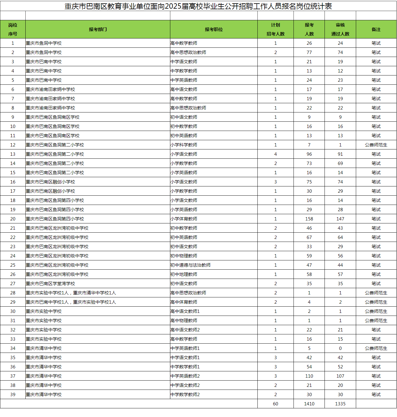 原標題:重慶市巴南區教育事業單位面向2025屆高校畢業生公開招聘工作人員報名崗位統計表