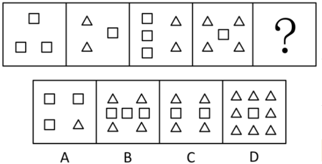 元素代換題目的背后其實是一組等差數列,例如上題是3、5、7、9,因此我們可以通過等差數列的性質來解題,等差數列中a1+a3=2(a2),運用到圖形推理中即為:前圖形+后圖形=2倍中間圖形,上題我們就可以以圖1+圖3=2倍圖2來解題,即(3正方形)+(3正方形+2三角)=2(1正方形+2三角形),化簡得到6正方形+2三角形=2正方形+4三角形,最后得到1三角形=2正方形。得到代換關系后,代入題干即可。