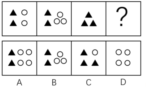 【解析】C。題干存在兩種元素,且無數量規律,考慮元素代換。運用前圖形+后圖形=2倍中間圖形的公式進行計算,(2三角形+2圓)+3三角形=2(2三角形+3圓),化簡得到,1三角形=4圓,題干圖形都代換后圓的個數依次為10、11、12,則?處應該等價于13個圓,只有C項符合,故本題答案為C項。